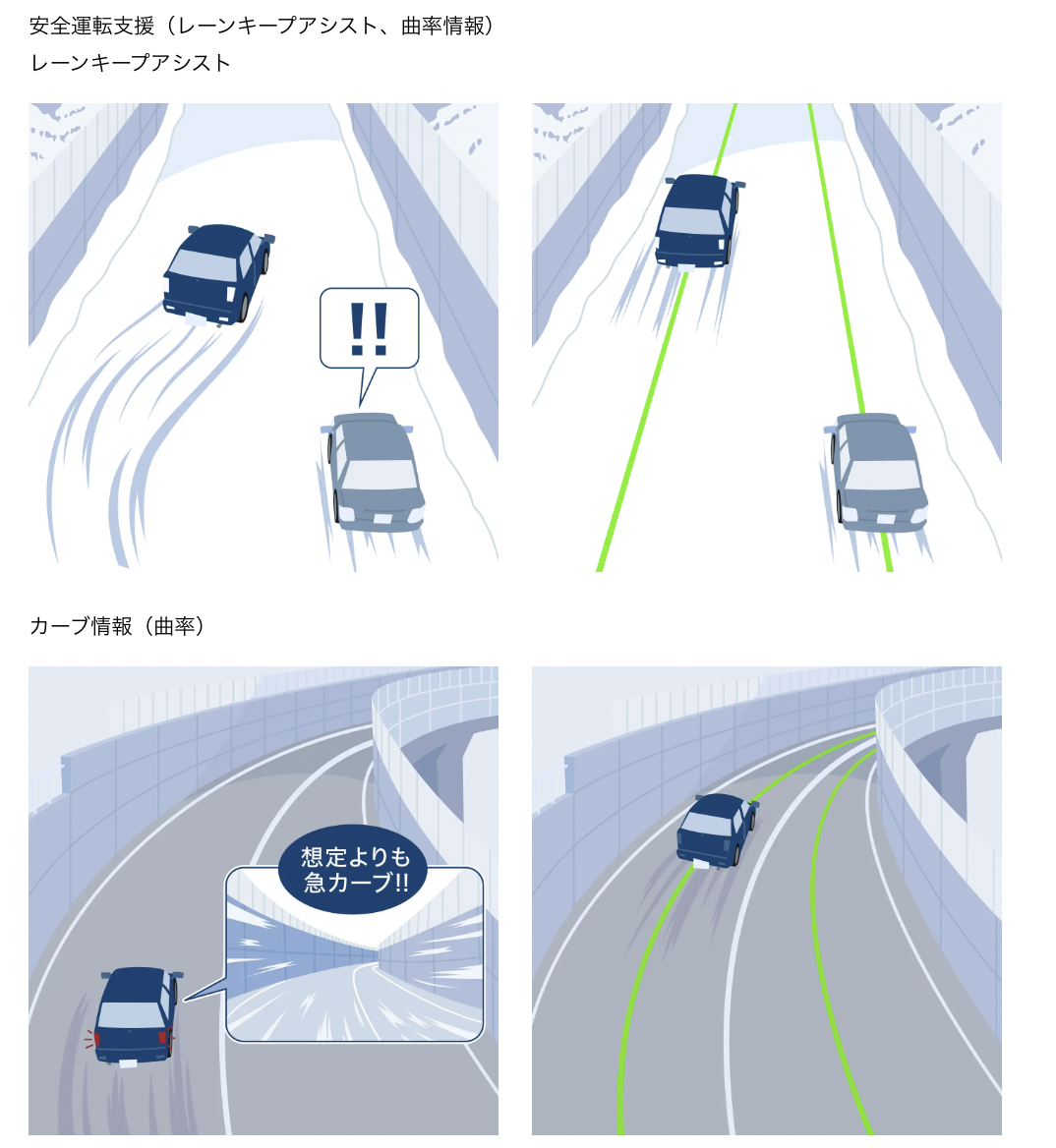 カーブ情報(曲率)では、道路の曲率データを活用して適切な速度制御や警告を行うことができる。