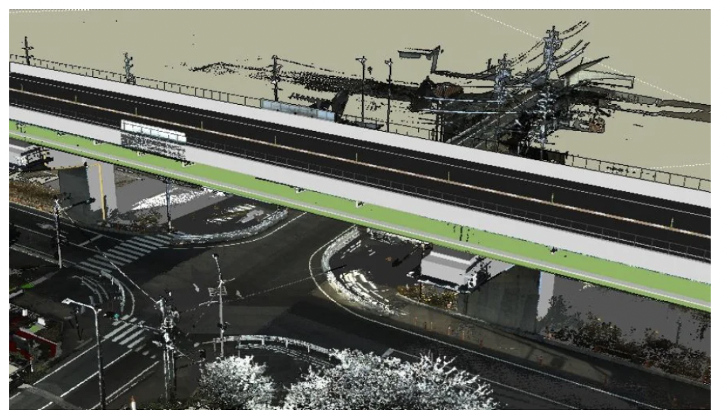 本モデルの概要は、3次元点群データと多様な道路属性情報を付与した車線中心線データ、高速道路施設情報等を含めた3次元CADデータ、モデリングデータで構成される。