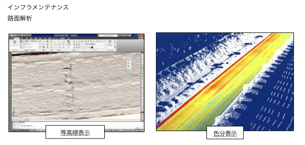 インフラメンテナンスでは、路面解析により路面の劣化状況を可視化し、道路管理・施設メンテナンス・設計業務では3次元CADデータを活用して効率的な管理や設計が可能となる。