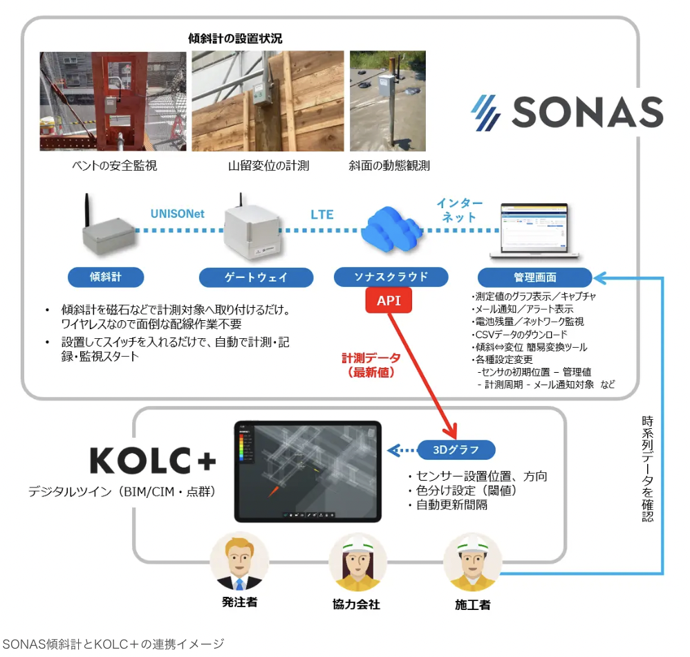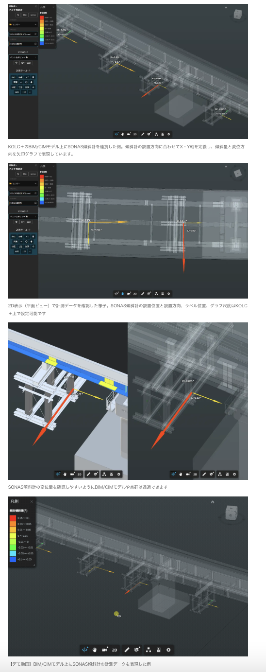 今回、SONASクラウドに実装したAPIを用いることで、蓄積された計測データをKOLC+で構築したデジタルツイン(BIM/CIM・点群など)にリアルタイムに転送して可視化できるようになった。