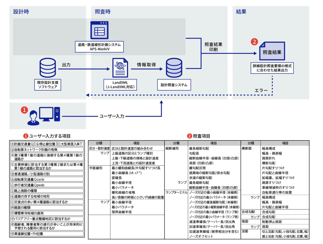 APS-DCは、道路設計データが道路構造令などの基準に適合しているかを自動で照査するシステムである。