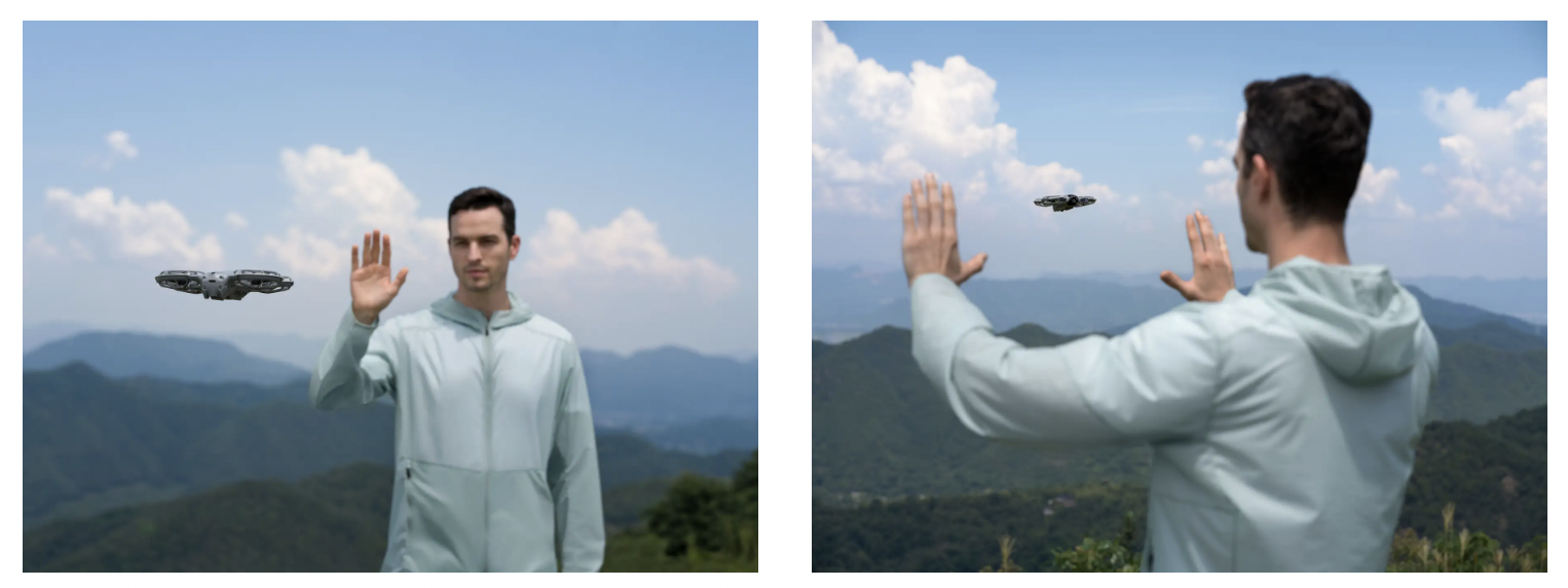 ジェスチャー操作時は片手または両手でドローンの飛行方向やドローンとの間の距離をコントロールできる。
