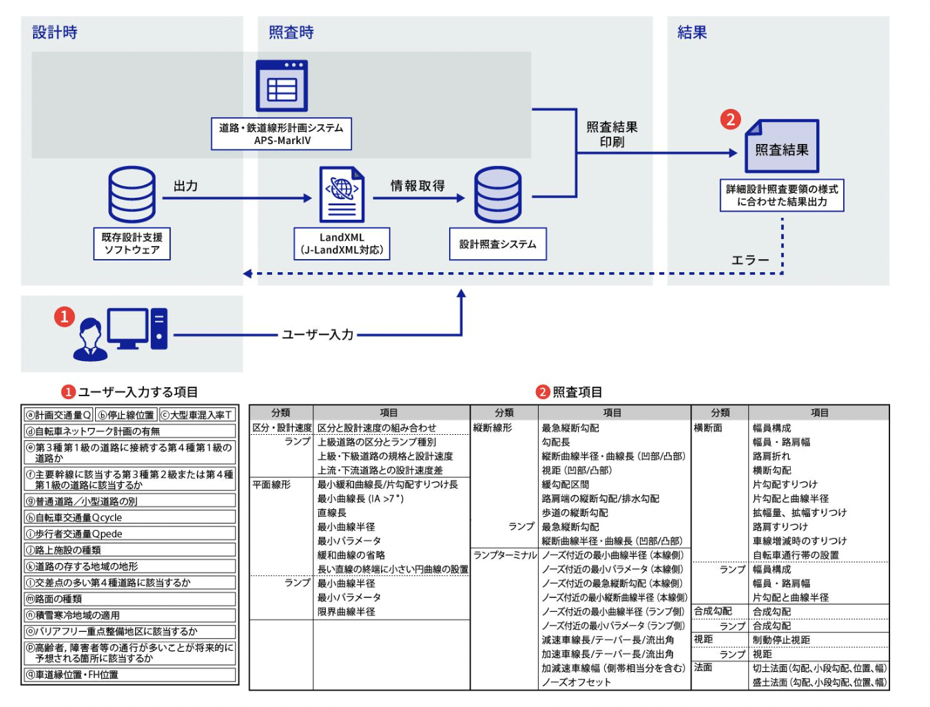 APS-DCは、道路設計データが道路構造令などの基準に適合しているかを自動で照査するシステムである。