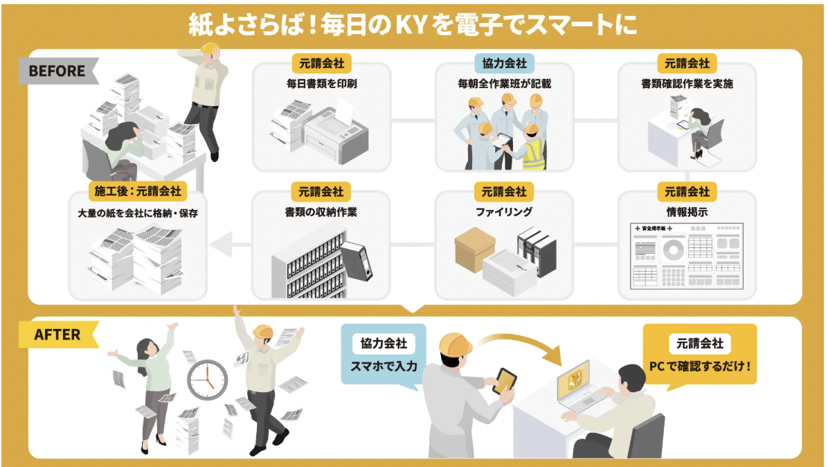 建設業界では、労働災害防止のために日々のKY活動が不可欠であるが、その記録は紙の帳票で行われることが多く、現場での管理負担が大きな課題となっていた。