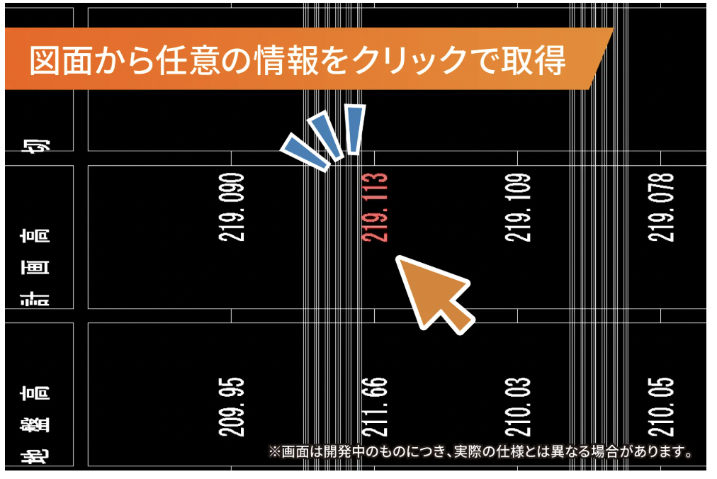 (図面から任意の情報をクリックで取得)また、計算書などの資料がない場合でも、図面上の文字をクリックするだけで情報を取得できる機能や、照査箇所を保存・共有する機能も搭載しており、作業者の交代による確認漏れも防ぐことができる。