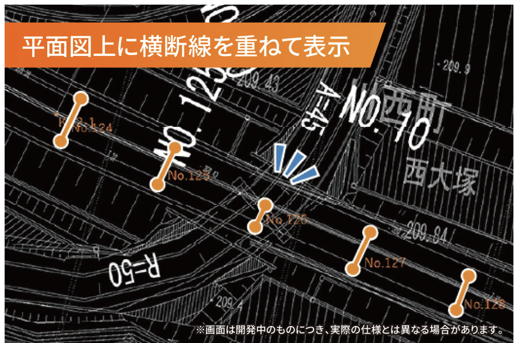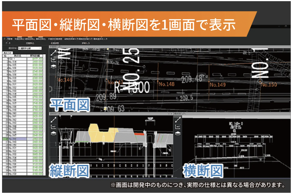 平面図上に横断線を重ねて表示したり、関連する複数の図面を1画面で並べて確認したりできるため、紙図面を広げて照らし合わせる手間が不要となる。