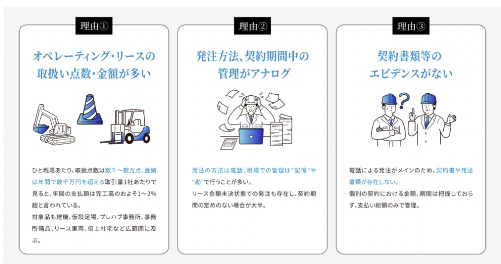 建設業では、重機や車両、足場材など多岐にわたる機材をリースで調達することが一般的だが、現場ごとの契約管理や返却漏れの防止、さらには会計処理への対応が大きな負担となっていた。