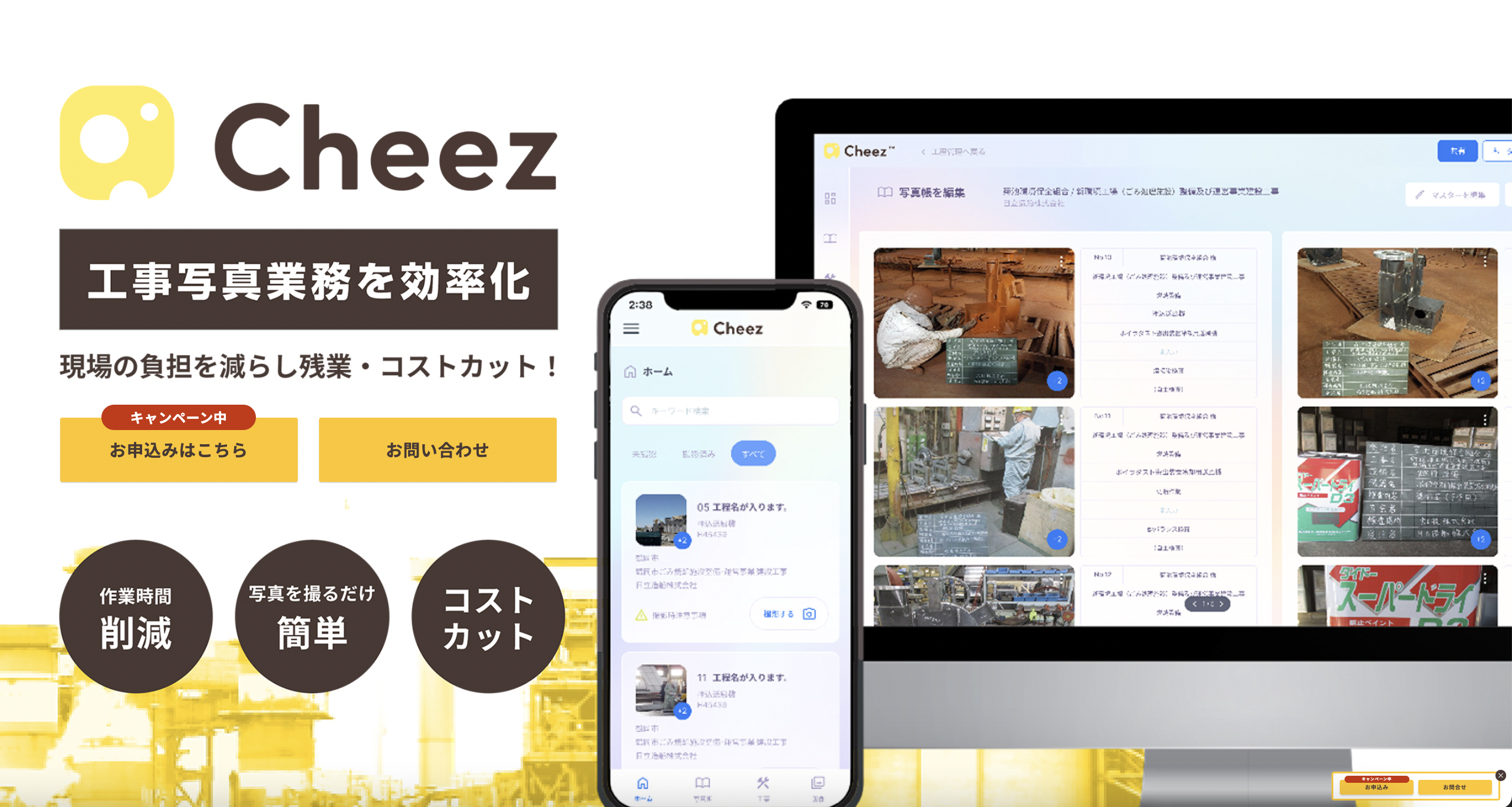 同社が展開するAI工事写真アプリ「Cheez」と専門スタッフによるBPO(業務委託)を組み合わせることで、工事写真台帳の作成や建設事務を“丸ごとお任せ”できる。