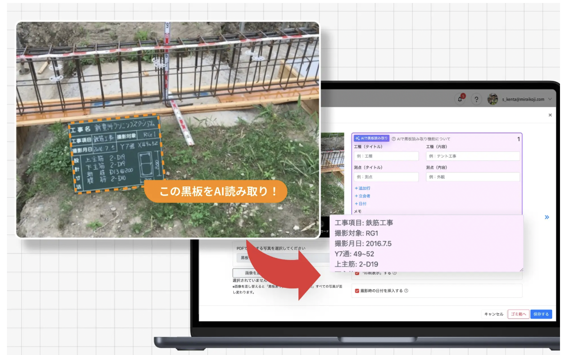 現場で撮影された小黒板の文字情報をAIが解析し、アプリ内の工種や測点といった台帳項目へ自動で反映する。