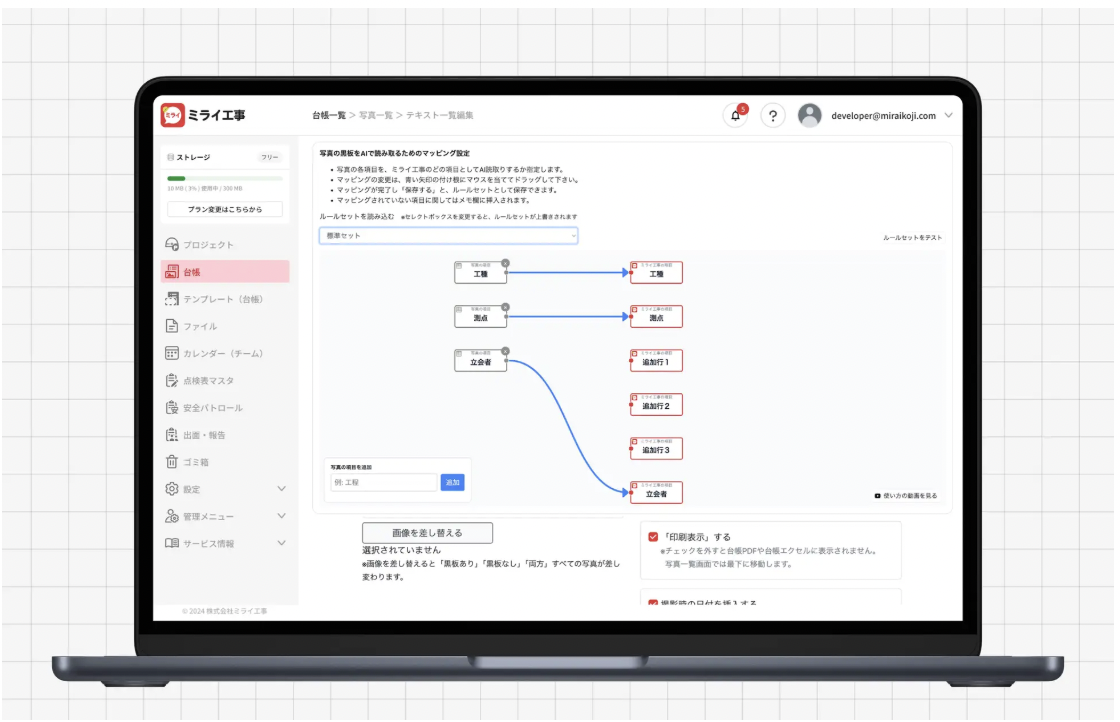 管理画面上で黒板のどの位置にどの項目(工種・測点・立会者名など)があるかをマッピング定義することで、現場や会社ごとに異なる黒板フォーマットにも柔軟に対応し、正確な読み取りを実現する。