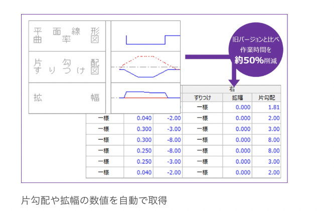 また、縦断図から測点名や片勾配、拡幅などの数値をワンクリックで自動取得できるようになった。