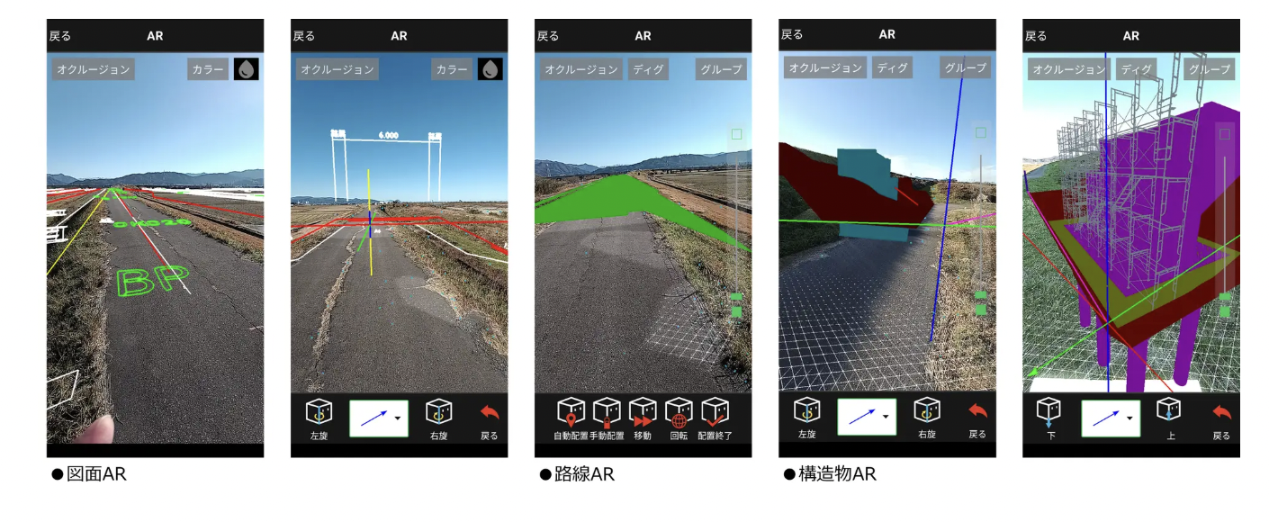 - 施工イメージの共有: 3次元設計モデルがない場合でも、平面図や横断図をAR投影することで、施工前の完成イメージを直感的に把握できる。