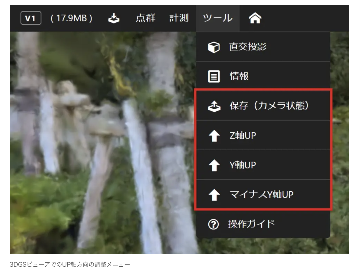 - 鉛直方向の調整: 3DGSデータで定義されていない「上方向(UP軸)」をWeb上で簡単に補正・保存可能。
