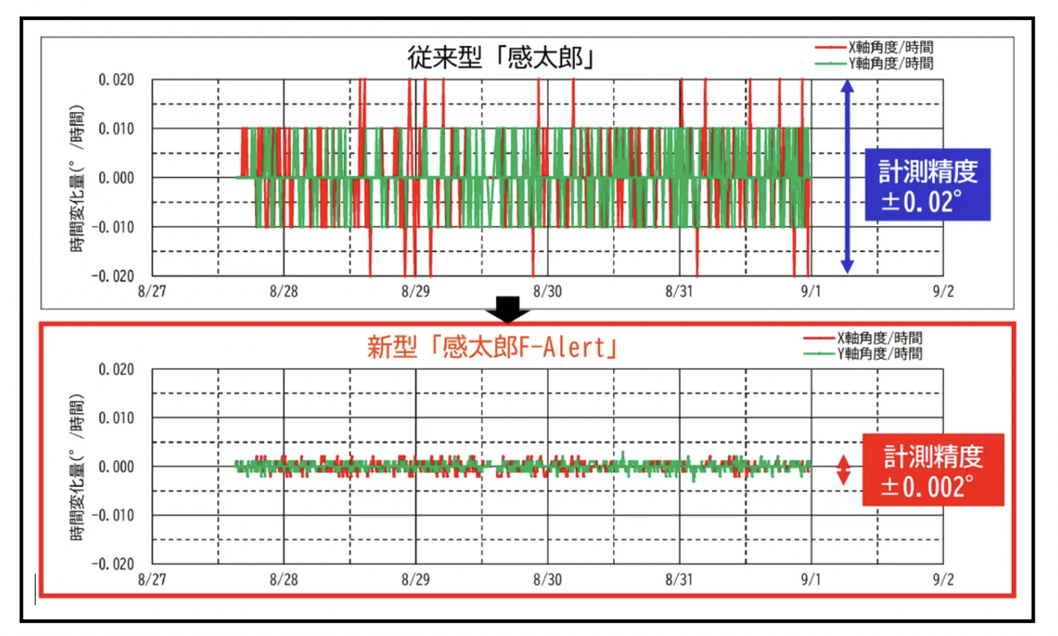 - 精度向上: 分解能0.001°、計測精度±0.002°を実現し、より微細な変動を検知可能に。