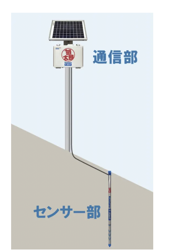 「感太郎」は、表層地盤の傾斜角度を常時計測し、崩壊の「予兆」となる微細な動きを検知するシステムである。