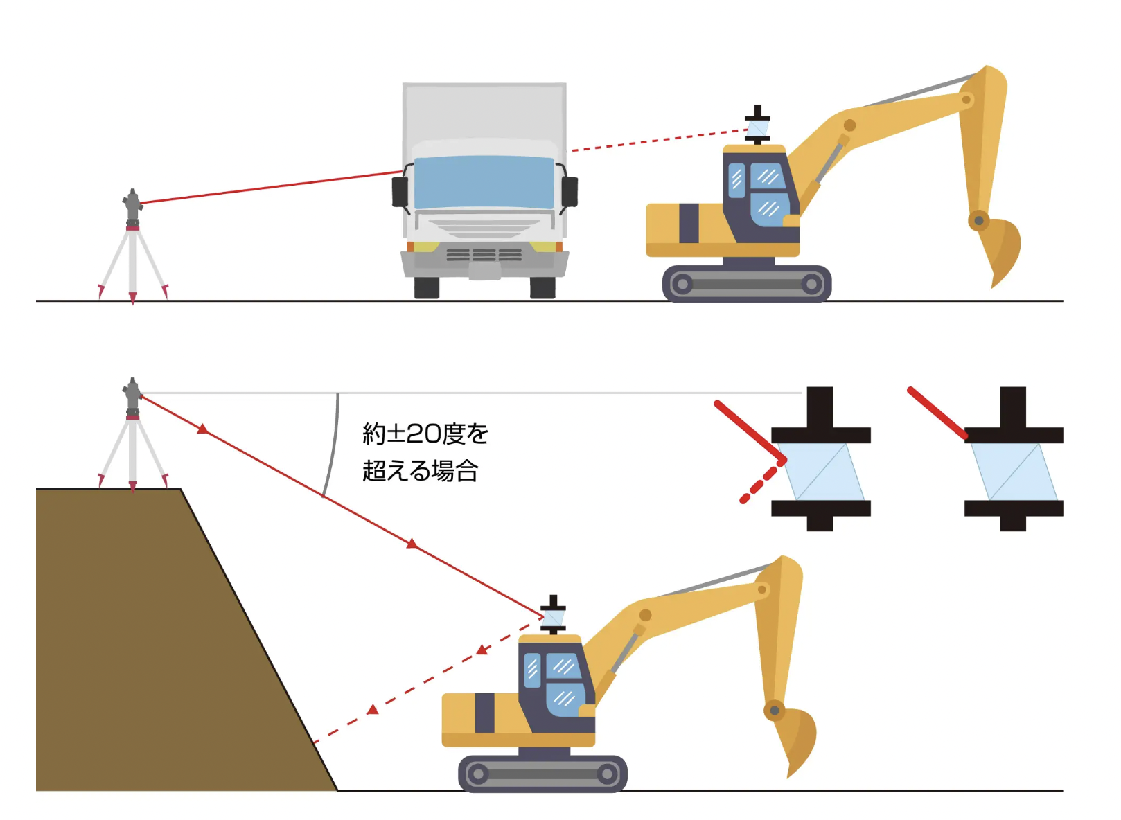 これを防ぐには測量機を高い位置に設置するのが有効だが、従来の360°プリズムでは、高い位置からのレーザー入射角が鋭くなると反射率が低下し、追尾が途切れる問題があった。