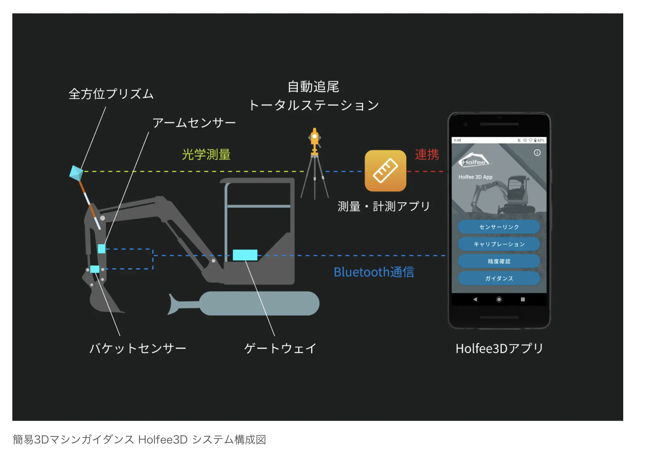 スイングブームやオフセットブームにも対応する「Holfee3D」と組み合わせることで、建機の動きに強い、止まらない現場を実現する。