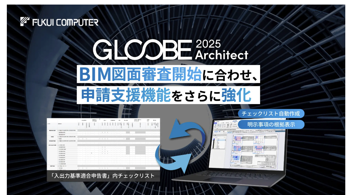 福井コンピュータアーキテクト(福井県坂井市)は、国産BIM建築設計支援システム「GLOOBE Architect」において、2026年4月から本格化するBIM図面審査に対応した機能強化を行い、2026年4月8日より提供開始すると発表した。