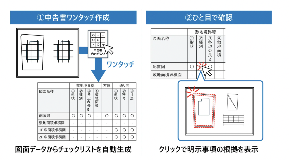 チェック項目をクリックするだけで、根拠となる図示状況や整合性が確認でき、手動で約4時間かかっていた作成・照合業務を大幅に短縮する。