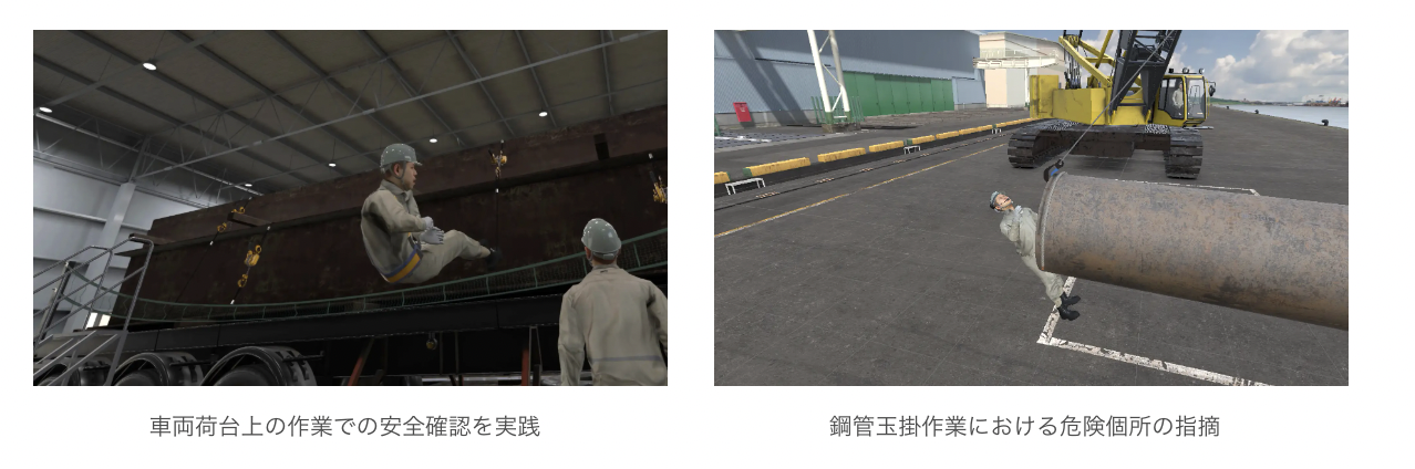 鋼管の玉掛けや車両荷台上での作業をVR空間で再現。作業手順の確認や指差呼称を実践し、もし危険箇所の指摘が漏れれば「被災体験」が発生する。