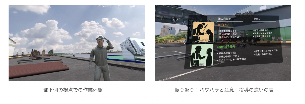 ヒューマンエラー防止のための危険予知訓練だけでなく、現場での「指導」がパワハラと受け取られないためのコミュニケーション訓練までをVRでカバーする画期的な取り組みだ。