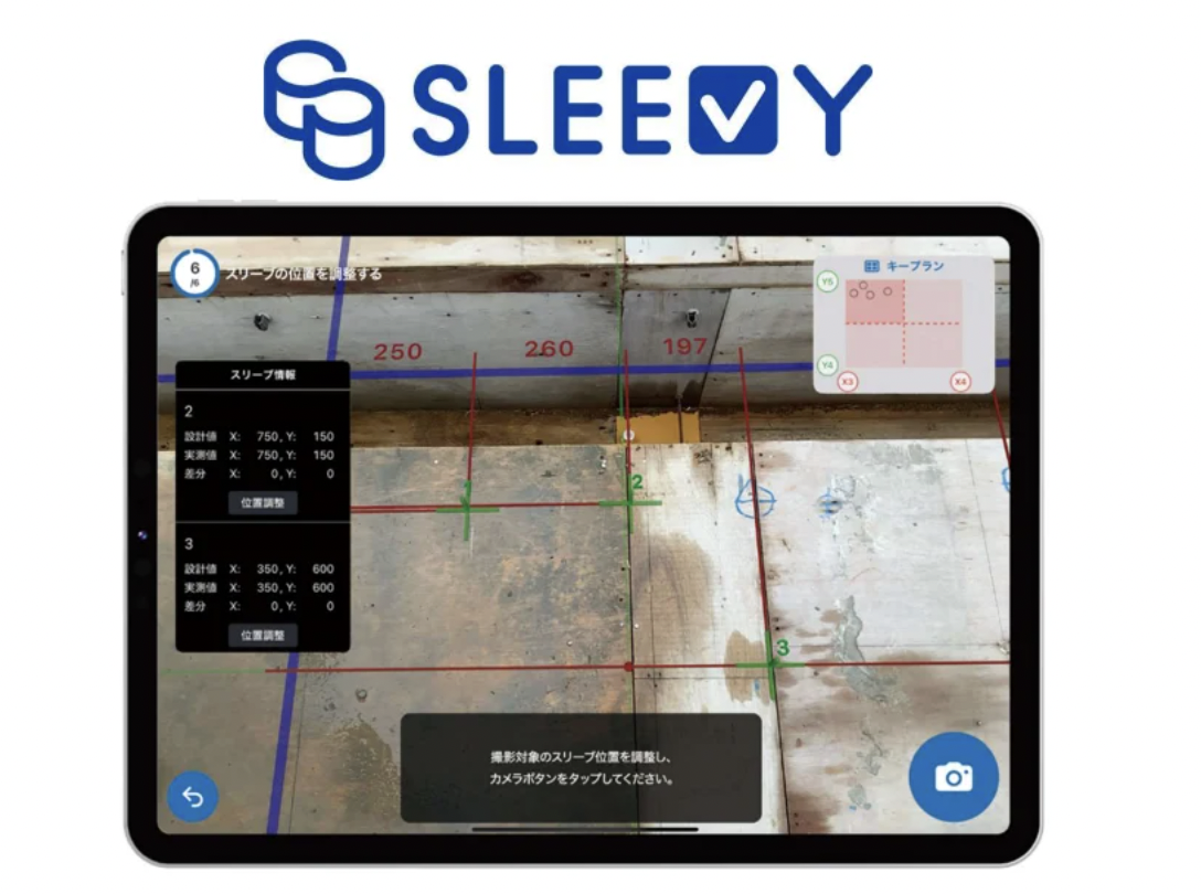 - AR重畳表示: BIMデータから取り込んだスリーブ位置を、iPadのカメラ映像にARで重ねて表示。検尺ロッドや紙図面を使わずに、設計値とのズレを直感的に確認できる。