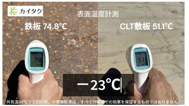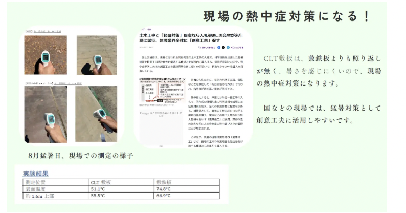 これに対し、木製の「ハイパーCLT敷板」は熱伝導率が低く、鋼製敷鉄板と比較して表面温度および体感温度を約20℃低減できることが実証されている。