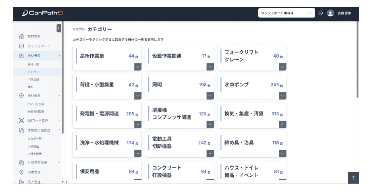 (カテゴリ画面)「ConPath-D」は、各社で異なる商品名やカテゴリーを自動で整理・統合し、現場にある全機材を1つの画面で表示する。