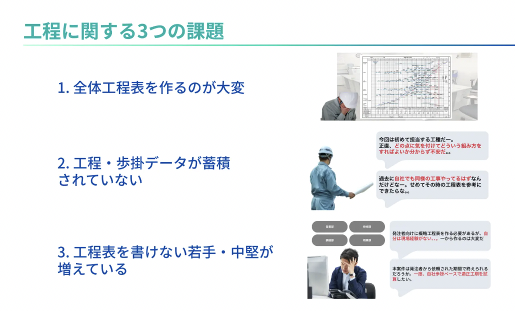 一つ目は、受注後1ヶ月以内に全体工程表を作成しなければならないという現場監督への大きな負担だ。二つ目は、Excelやオンプレソフトが主流のため会社独自の工程・歩掛データが蓄積されにくい点。