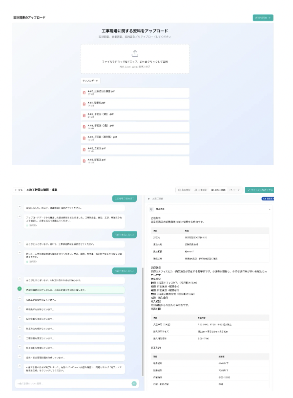 操作はシンプルで、担当者が設計図書(図面・仕様書・見積書)をドラッグ&ドロップでアップロードすると、AIが工期・工種・現場周辺環境・制約条件などを自動で整理する。