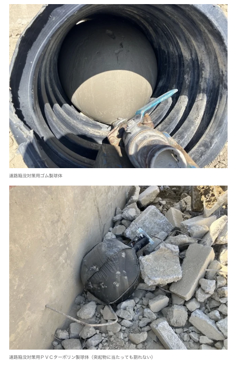 共和ゴム株式会社(大阪府枚方市)は2026年3月27日、道路下の地下空洞に小径孔から挿入し、流動化処理土やコンクリートを注入して膨張させる「道路陥没対策用球体」を2026年4月1日に発売する。