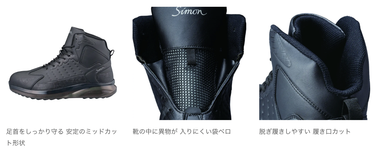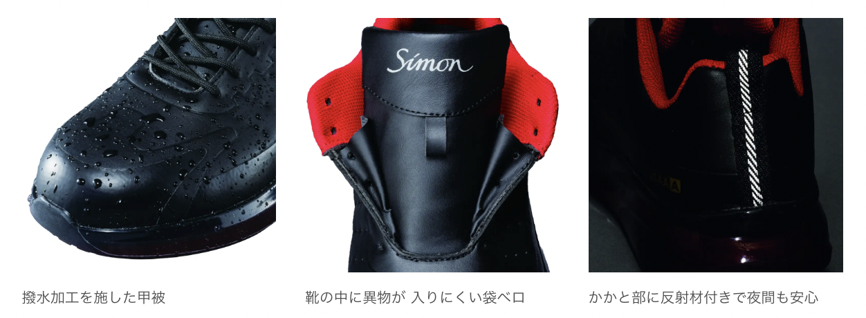 ローカットモデルには撥水加工の甲被・異物が入りにくい袋ベロ・かかとの夜間反射材を、ミッドカットモデルには足首をしっかり保護する形状と脱ぎ履きしやすい履き口カットをそれぞれ採用しており、現場の安全と作業性を両立する設計となっている。