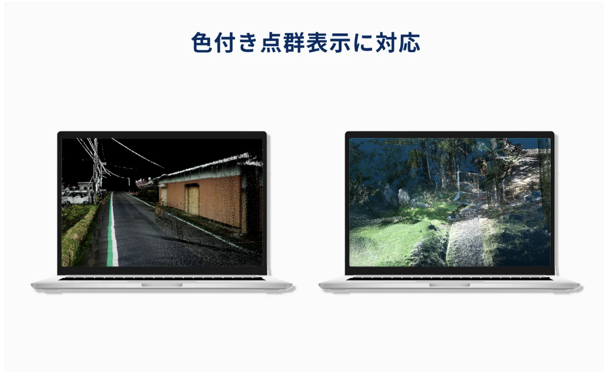 このほかハンディ利用時限定でGCP(標定点)を使った座標変換にも対応し、PC用ソフトウェアでのカラー点群表示も新たにサポートした。