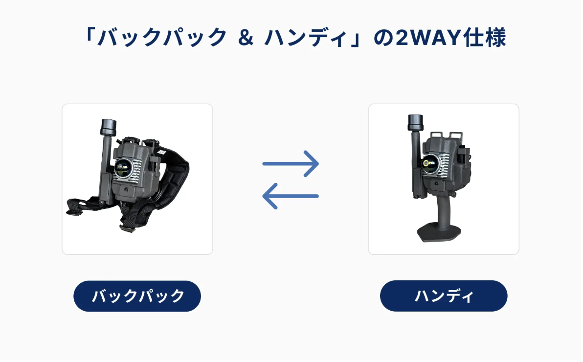 仕様面では従来のバックパック専用からバックパックとハンディを自由に切り替えられる2WAY仕様に進化した。