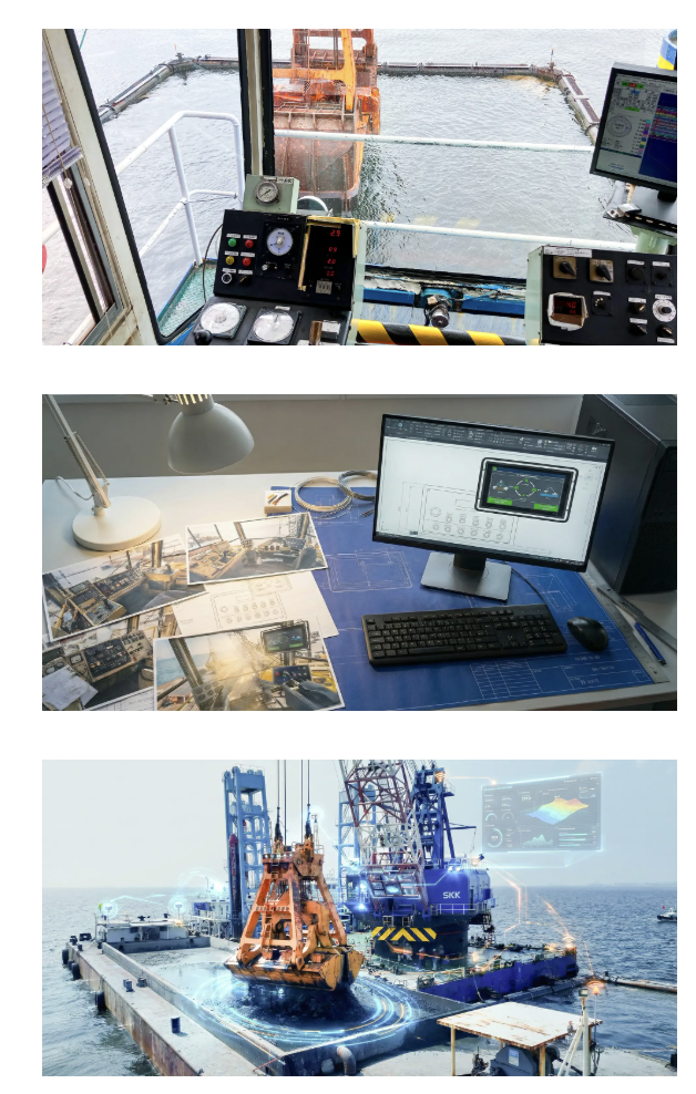 自社の汎用遠隔操縦装置「XAURS」で培ったノウハウをベースに、各船に合わせた遠隔操縦装置と自動制御ソフトを組み合わせることで、既存のグラブ浚渫船に後付けで自動化機能を実装できる。
