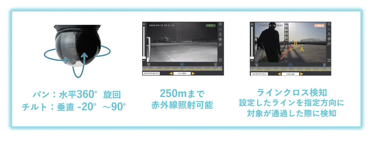 最大250m赤外線照射・48倍ズームで遠距離の夜間監視。AIが侵入・滞留・方向・ラインクロスを自動検知