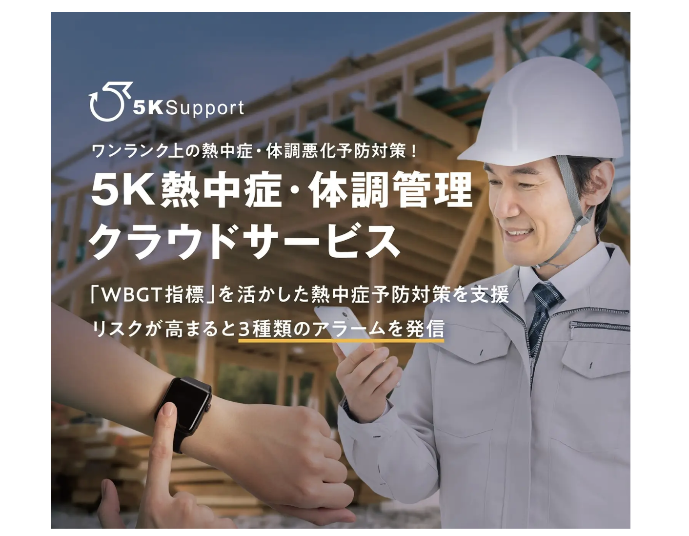 5Kサポート株式会社(横浜市)は2026年4月14日、建設業など高温環境下で働く現場向けに、WBGT予防対策・3種アラーム・クラウド記録を一体化した「5K熱中症・体調管理クラウドサービス」の提供を開始した。