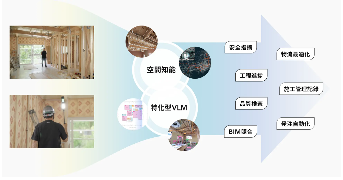 建設現場の空間・物体・意味情報を時系列で統合したマルチモーダルな現場データを基盤とすることで、画像内の物体認識だけでなく、現場全体を空間として捉え位置関係・空間構造・図面対応・過去との連続性を踏まえた状況理解と施工管理判断につながる情報処理を可能にしている。