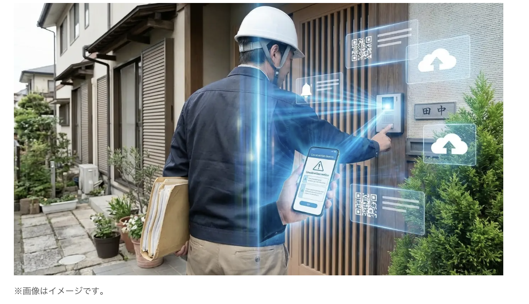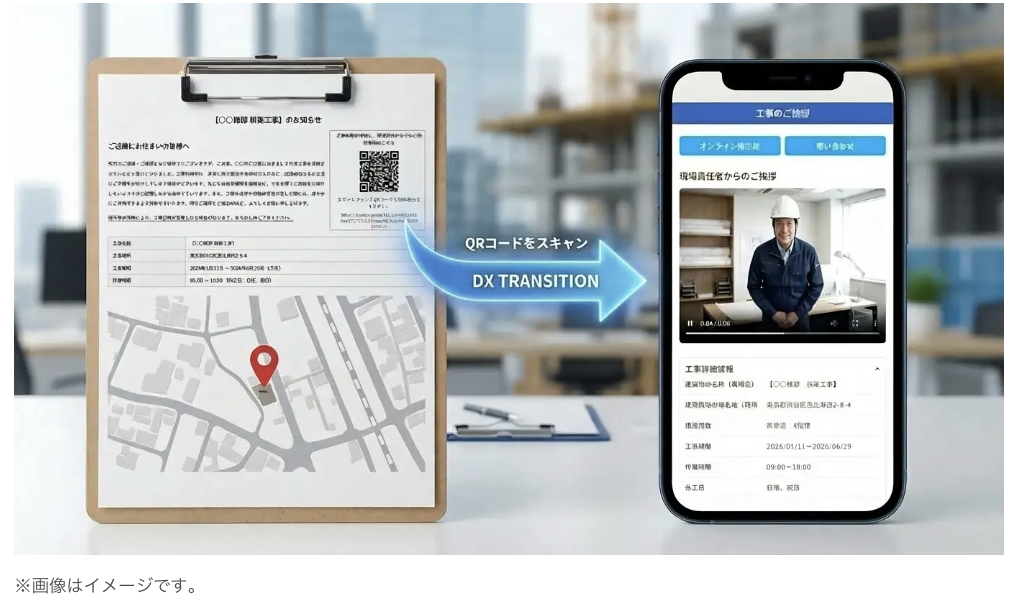 訪問と紙による挨拶を入口としながら、紙に掲載したQRコードから現場専用のデジタル掲示板へ誘導する独自の仕組みで、アナログな近隣対応を現場の運用フローに無理なく組み込めるDX設計が特徴だ。
