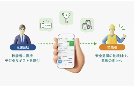 そしてインセンティブ施策機能では、現場での就労実績や安全講習参加に応じてデジタルギフトを付与でき、CCUS技能レベルと連動したポイント設計も可能だ。