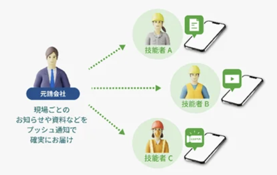 主な機能は3つある。まず技能者個人への情報伝達機能で、本社・現場単位のお知らせや朝礼動画・新規入場者教育動画を配信し、クイズ形式アンケートで確認状況を記録できる。